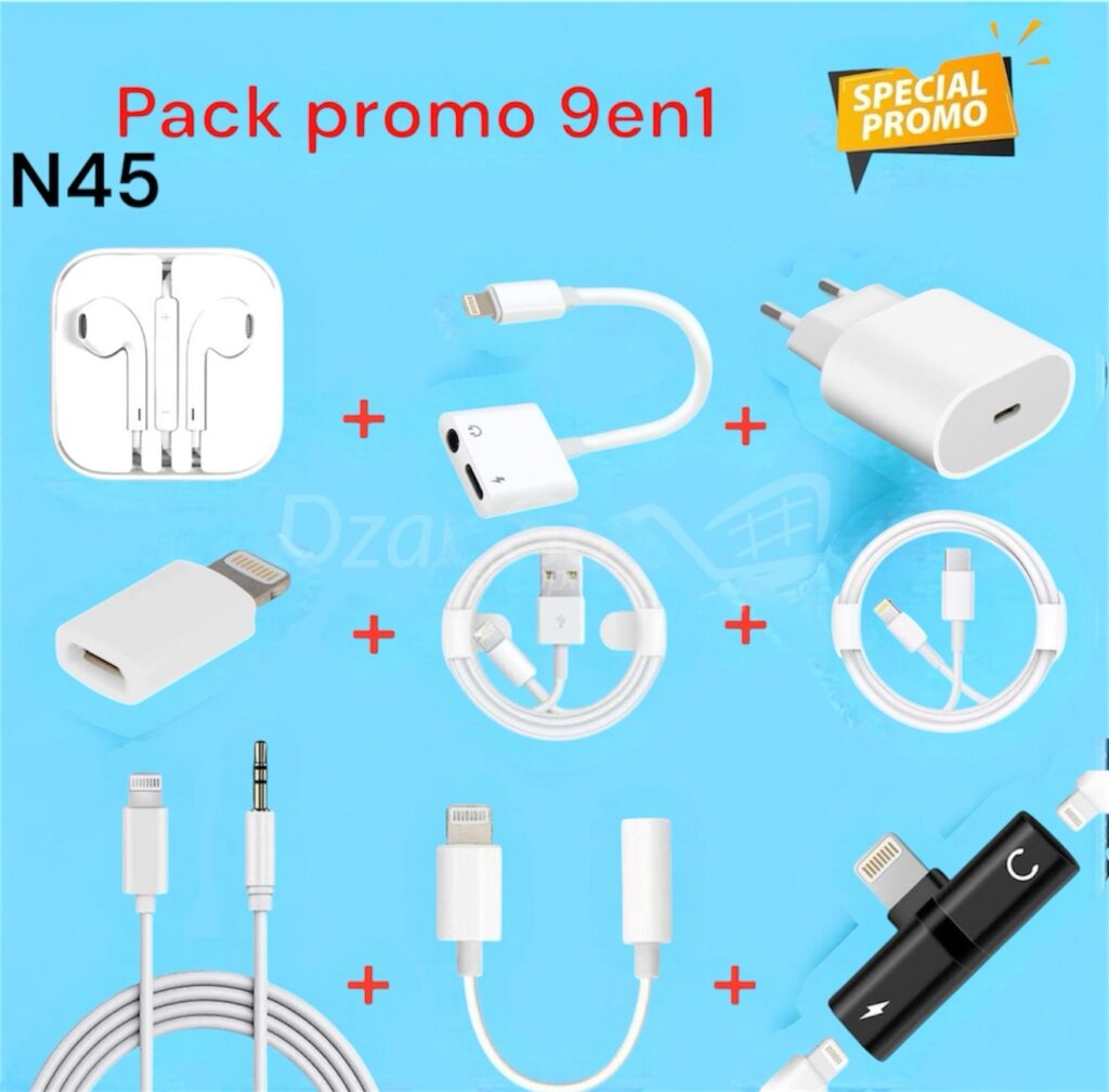 حزمة 9en1 N45/ 9 محول iPhone Lightning المساعد من النوع C / سماعات / شاحن / كابل