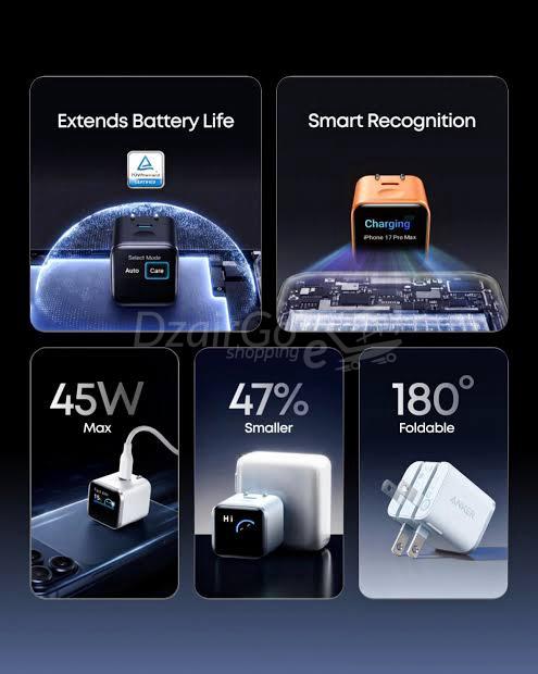 Le chargeur Anker Nano 45W GaN avec écran intelligent offre une charge rapide, puissante et intelligente dans un format compact. Grâce à son écran intelligent en temps réel, vous pouvez visualiser instantanément la puissance de charge et vérifier que votre appareil bénéficie d’une vitesse maximale. Sa puissance de 45 W permet une charge rapide pour les smartphones haut de gamme comme le Samsung Galaxy S Ultra (PPS Super Fast Charging), الأجهزة اللوحية, le MacBook Air et autres appareils USB-C.