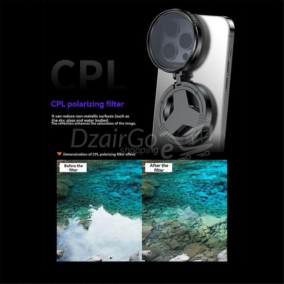 DIAMÈTRE UNIVERSEL DE 52 مم: Grâce à son diamètre de 52 mm, ce filtre est compatible avec une large gamme d’objectifs et d’accessoires pour smartphones. Ce format standard offre une grande flexibilité et permet de l’utiliser avec divers outils de photographie sur smartphone.