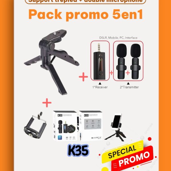 Le prix initial était : 3.000 د.ج.2.350 د.جLe prix actuel est : 2.350 د.ج.Pack promo 5en1 support trépied universel + double microphone sans fils Bluetooth auxiliaire