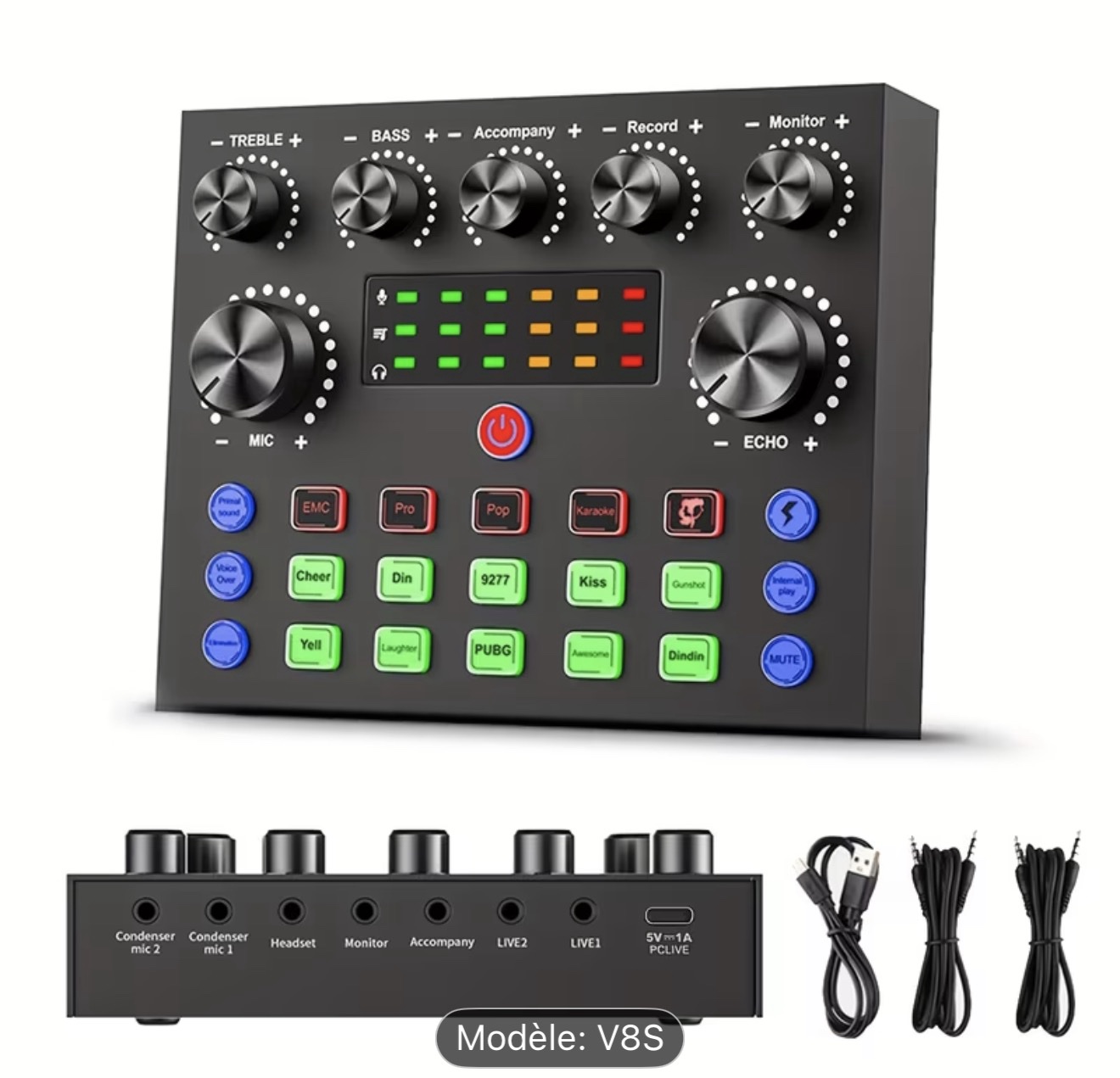 Équipement de studio d’enregistrement professionnel : il s’agit d’un équipement simple mais professionnel. Ensemble d’équipements d’interface audio pour vous aider à traiter le son de la diffusion en direct ou de l’enregistrement. L’avantage est sa simplicité d’utilisation et son faible taux de défaillance. Le mixeur V8S dispose de 13 fonctions telles que l’écho, le retour en arrière, le doublage haut et bas et la suppression du bruit. Une variété d’effets sonores et plusieurs modes de changement de voix/voix