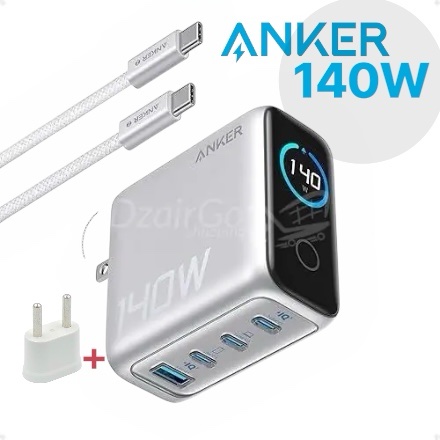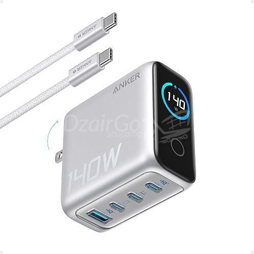 Chargeur pour ordinateur portable Anker, bloc chargeur USB-C GaN 4 ports 140 W max avec affichage intelligent, adaptateur secteur à charge rapide, commandes tactiles pour MacBook, iPad, iPhone séries 16/17 (câble de 1,5 m inclus, sans batterie)